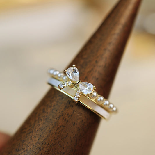 Gold-Plated Bow Ring – Mother of Pearl & Pearl Stacking Band